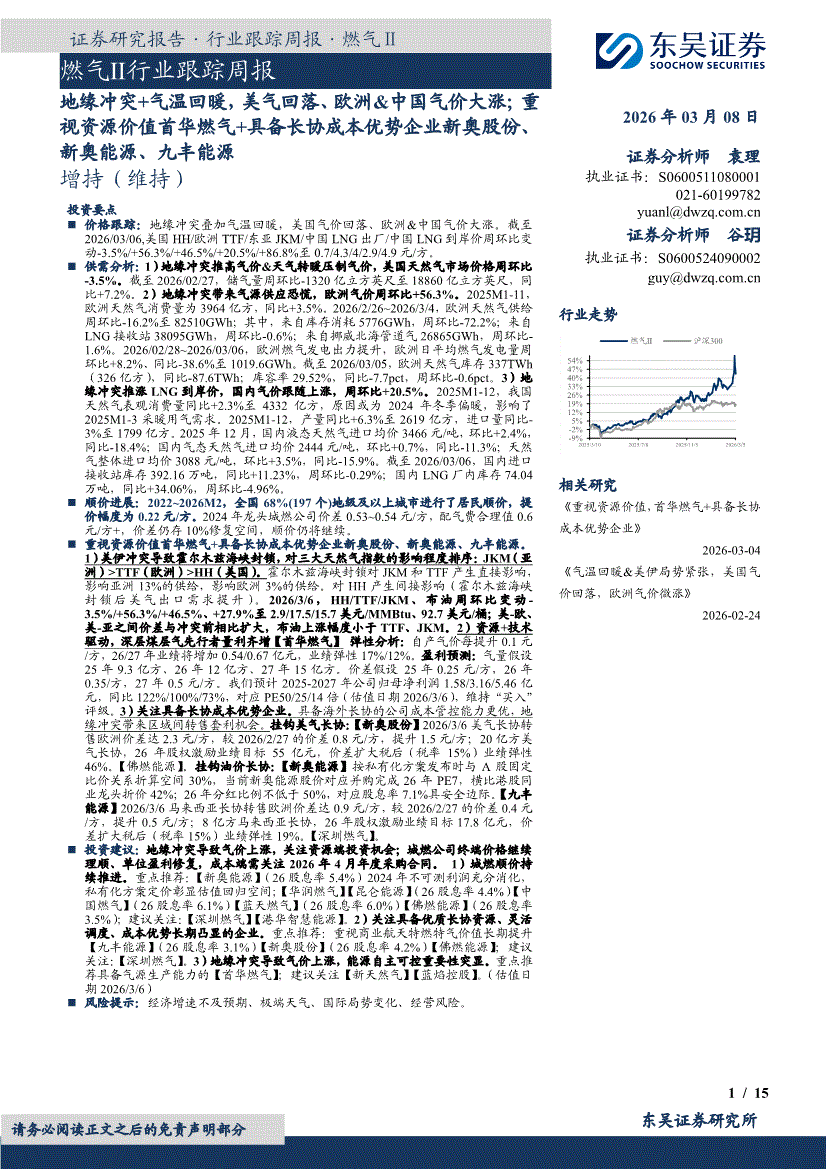 燃气行业:东吴证券-燃气Ⅱ行业跟踪周报:地缘冲突+气温回暖,美气回落、欧洲&中国气价大涨;重视资源价值首华燃气+具备长协成本优势企业新奥股份、新奥能源、九丰能源-260308