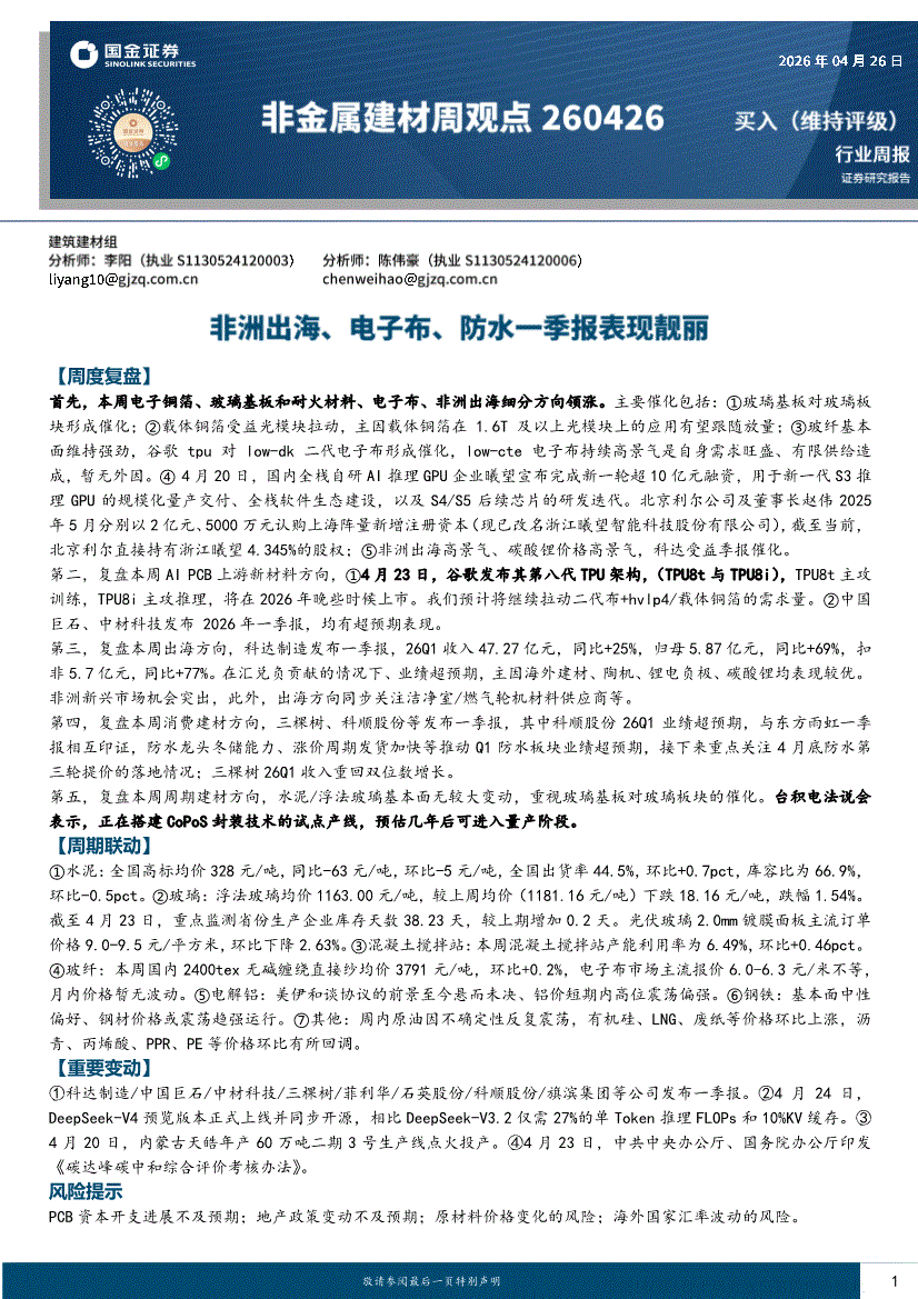 非金属建材行业:国金证券-非金属建材行业周观点:非洲出海、电子布、防水一季报表现靓丽-260426