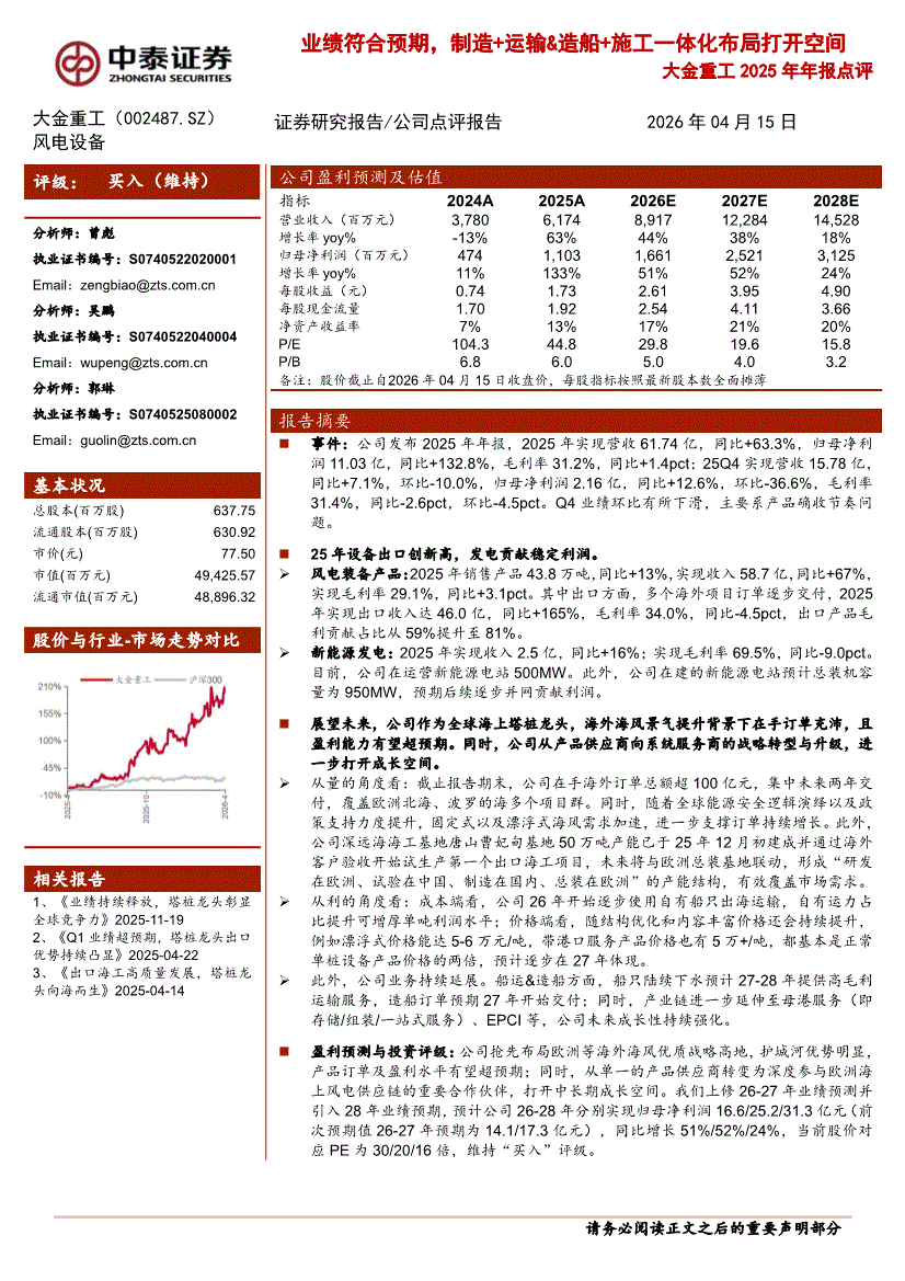 大金重工:中泰证券-大金重工-002487-2025年年报点评:业绩符合预期,制造+运输&造船+施工一体化布局打开空间-260415
