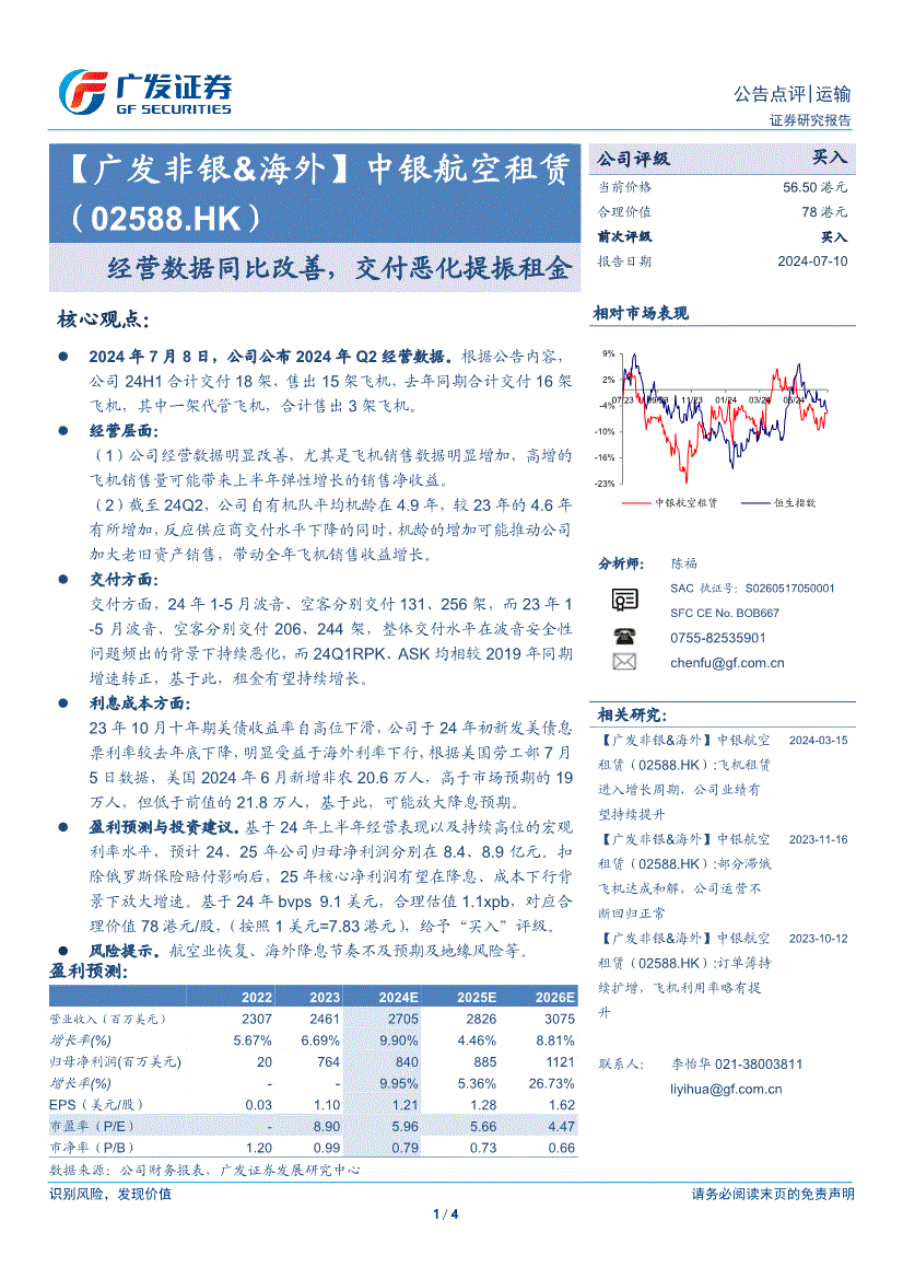 中银航空租赁:广发证券-中银航空租赁-2588.HK-经营数据同比改善,交付恶化提振租金-240710