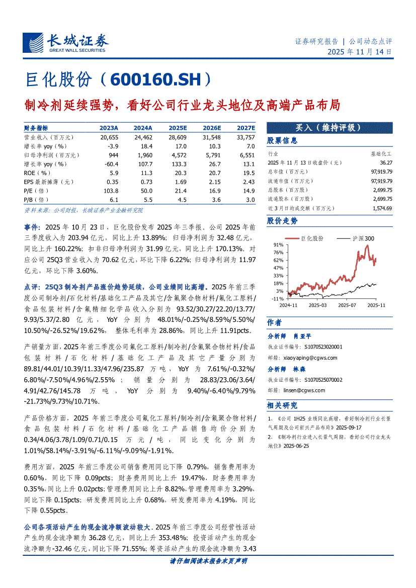 巨化股份:长城证券-巨化股份-600160-制冷剂延续强势,看好公司行业龙头地位及高端产品布局-251114