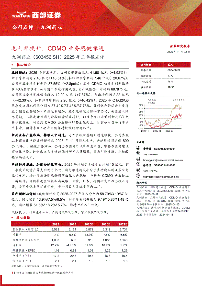九洲药业:西部证券-九洲药业-603456-2025年三季报点评:毛利率提升,CDMO业务稳健推进-251102
