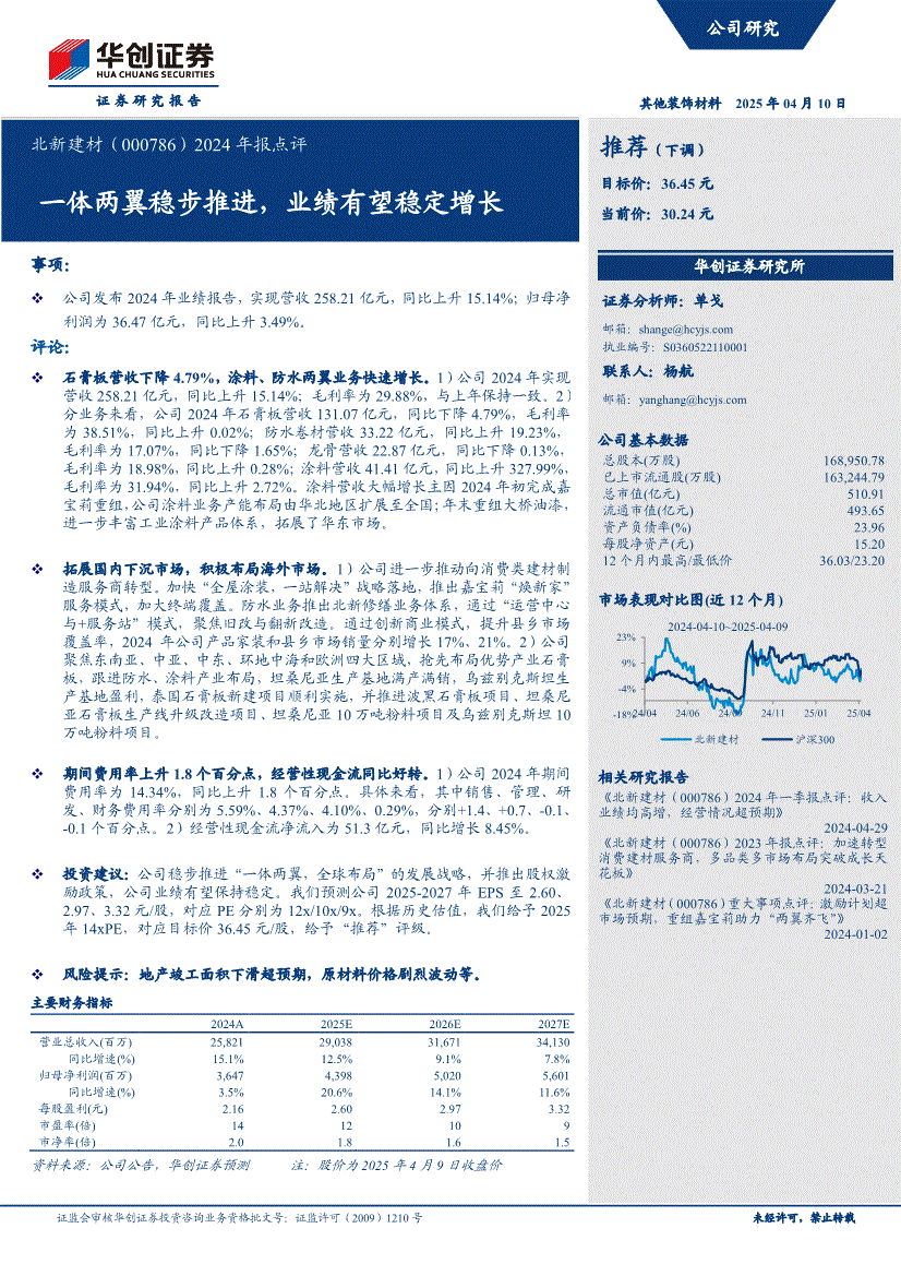 北新建材:华创证券-北新建材-000786-2024年报点评:一体两翼稳步推进,业绩有望稳定增长-250410
