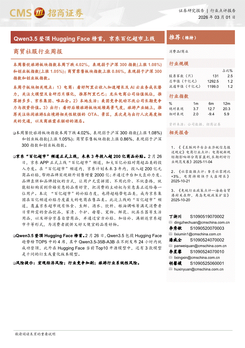 商贸社服行业:招商证券-商贸社服行业周报:Qwen3.5登顶Hugging Face榜首,京东百亿超市上线-260301