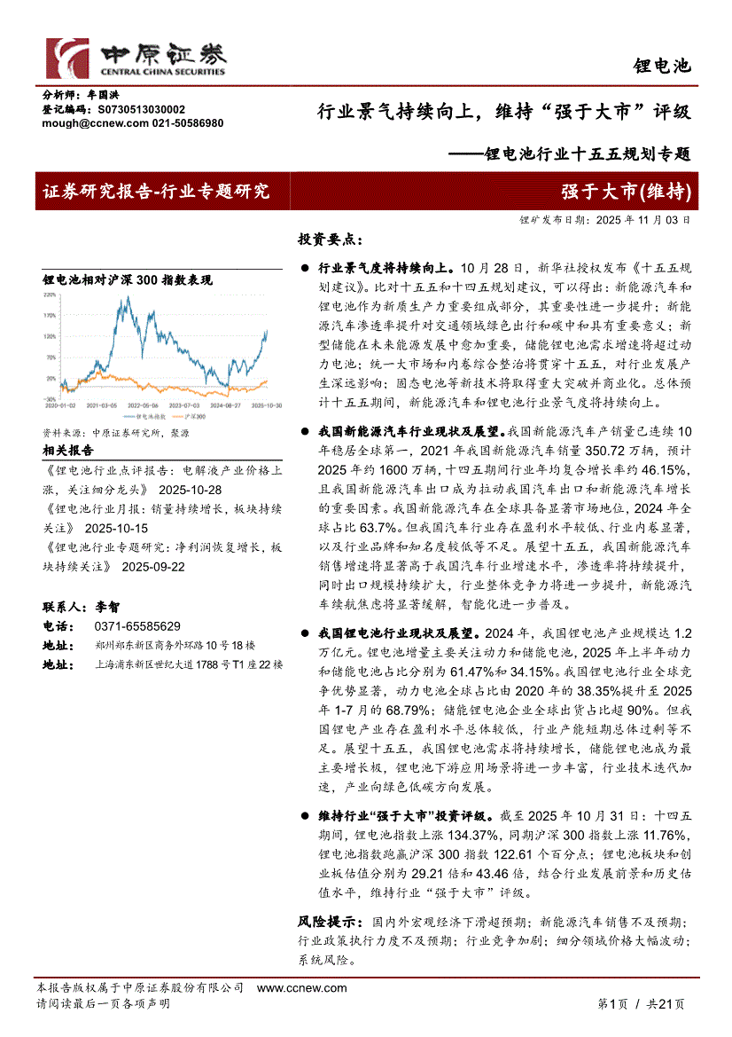 锂电池行业:中原证券-锂电池行业十五五规划专题:行业景气持续向上,维持“强于大市”评级-251103