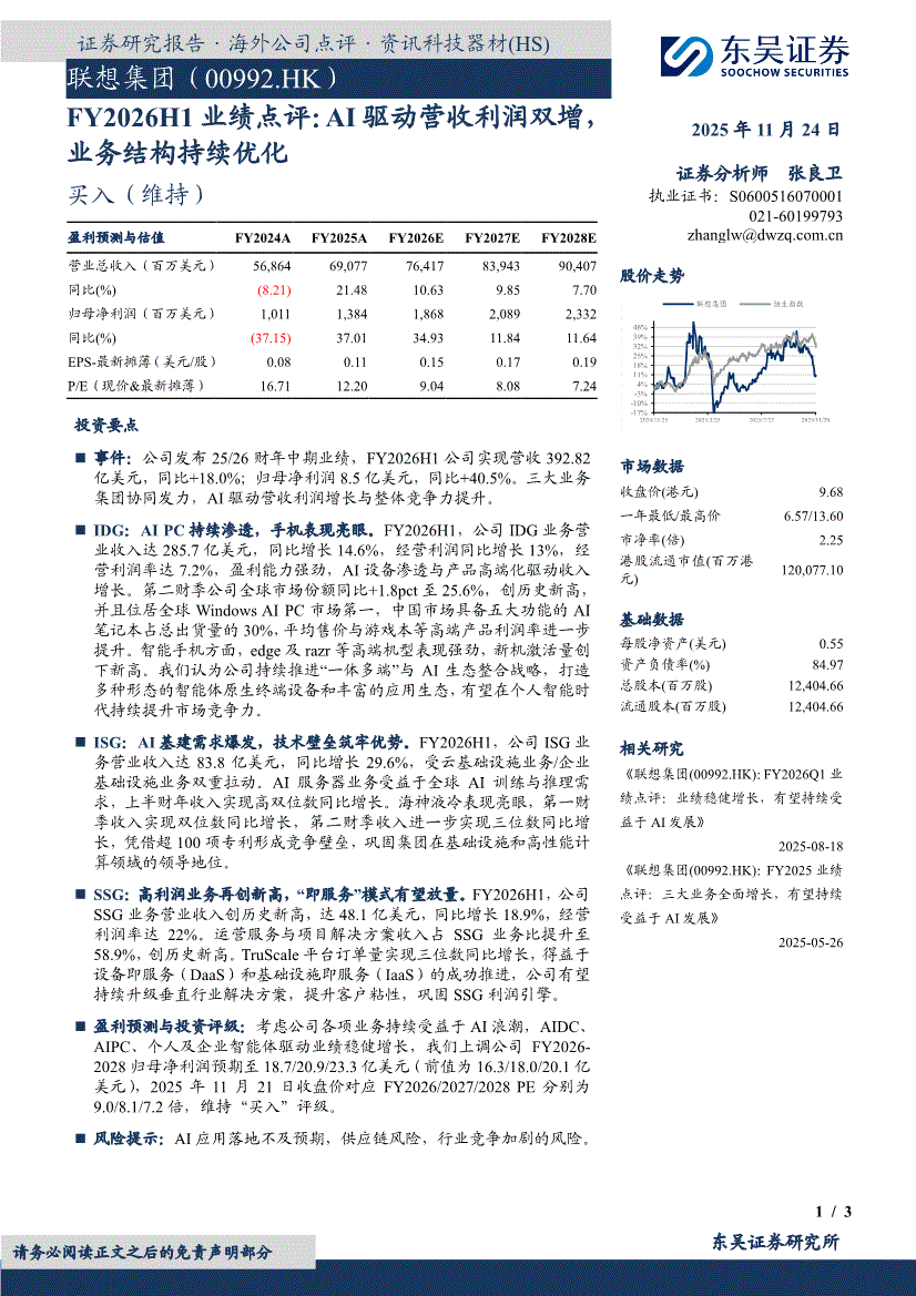 联想集团:东吴证券-联想集团-0992.HK-FY2026H1业绩点评:AI驱动营收利润双增,业务结构持续优化-251124