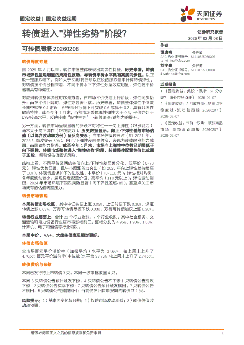 天风证券-可转债周报:转债进入"弹性劣势"阶段?-260208
