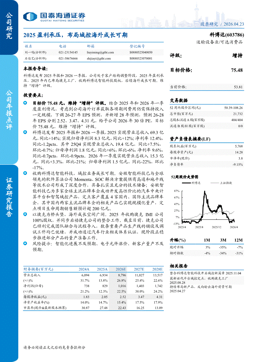 科博达:国泰海通证券-科博达-603786-2025盈利承压,布局域控海外成长可期-260423