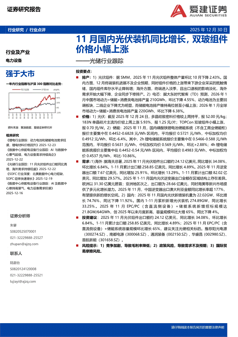 电力设备行业:爱建证券-光储行业跟踪:11月国内光伏装机同比增长,双玻组件价格小幅上涨-251230