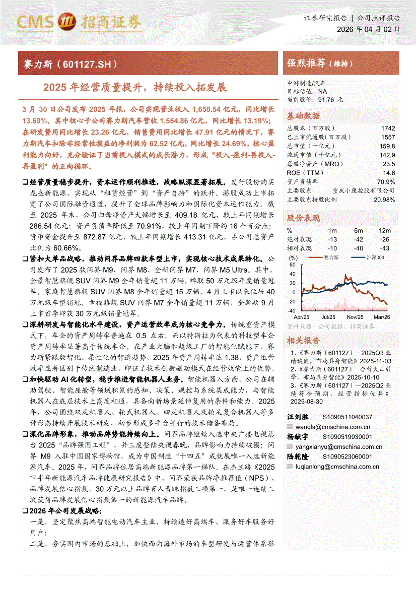 赛力斯:招商证券-赛力斯-601127-2025年经营质量提升,持续投入拓发展-260402