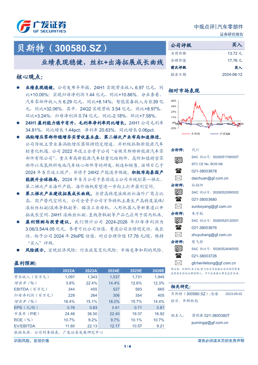 贝斯特:广发证券-贝斯特-300580-业绩表现稳健,丝杠+出海拓展成长曲线-240812