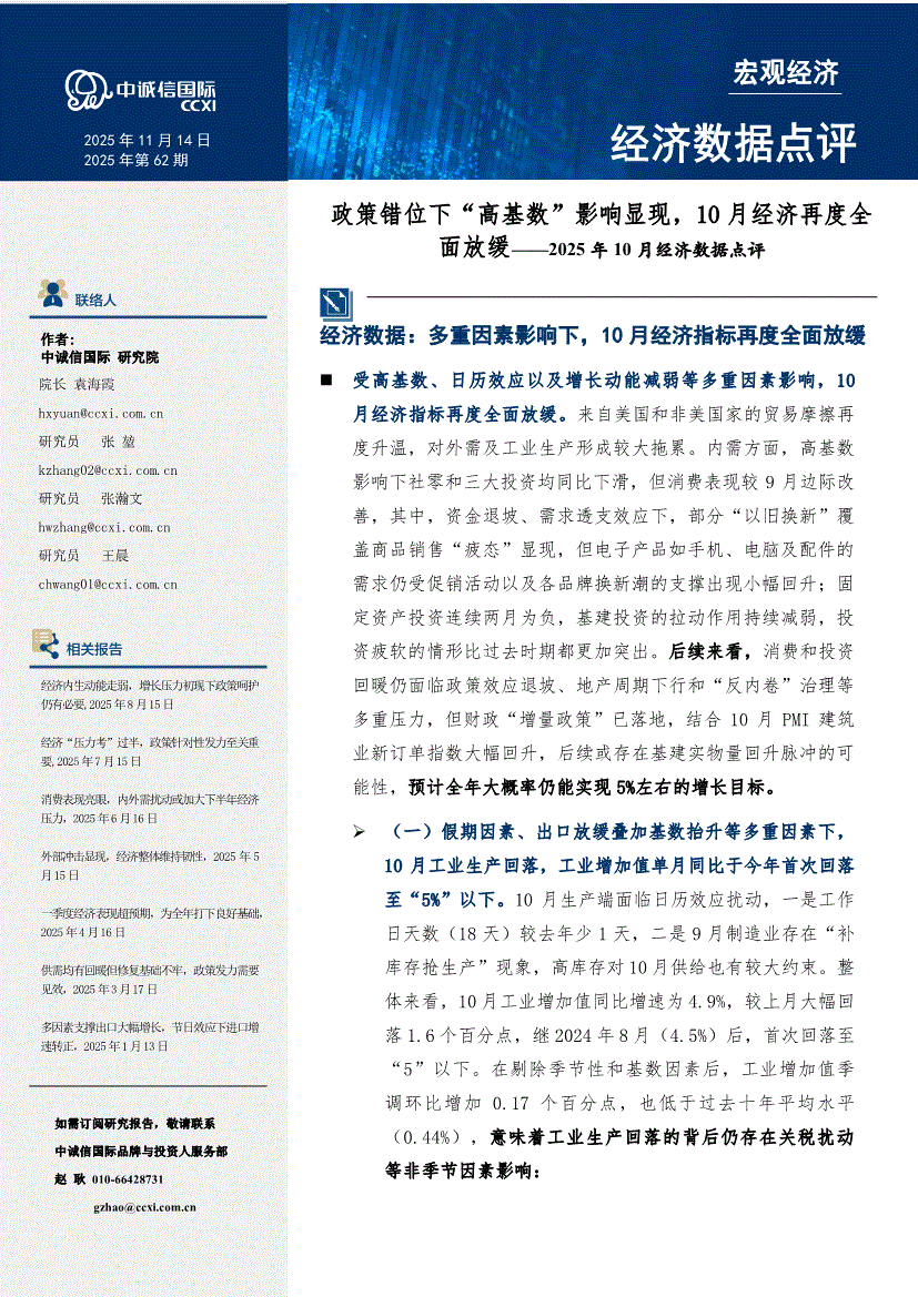中诚信国际-2025年10月经济数据点评:政策错位下高基数影响显现,10月经济再度全面放缓-251114