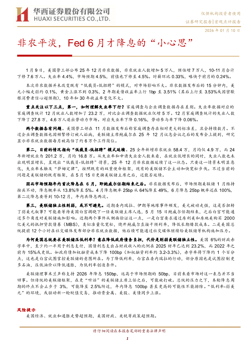 华西证券-宏观点评报告:非农平淡,Fed 6月才降息的“小心思”-260110