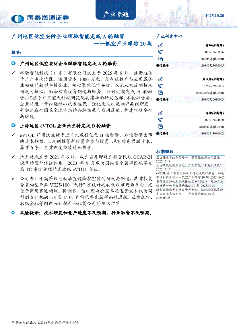 国泰海通证券-产业专题:广州地区低空安防企业辉驰智能完成A轮融资——低空产业跟踪20期-251020