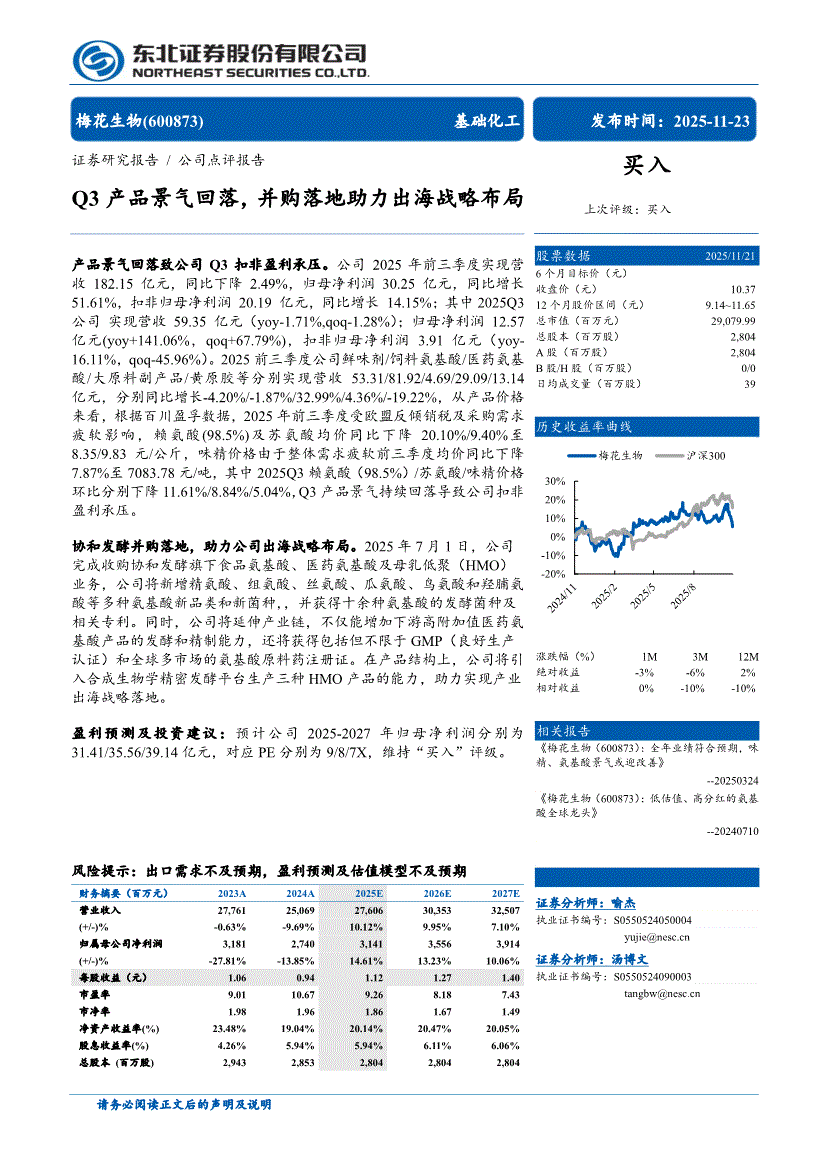 梅花生物:东北证券-梅花生物-600873-Q3产品景气回落,并购落地助力出海战略布局-251123