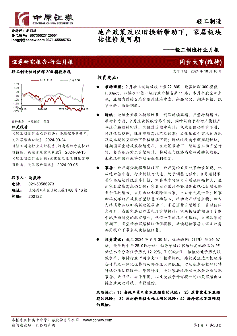 轻工制造行业:中原证券-轻工制造行业月报:地产政策及以旧换新带动下,家居板块估值修复可期-241010