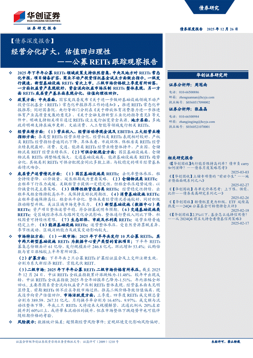 华创证券-【债券深度报告】公募REITs跟踪观察报告:经营分化扩大,估值回归理性-251226