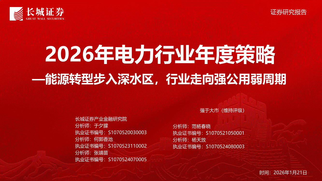 电力行业:长城证券-2026年电力行业年度策略:能源转型步入深水区,行业走向强公用弱周期-260121
