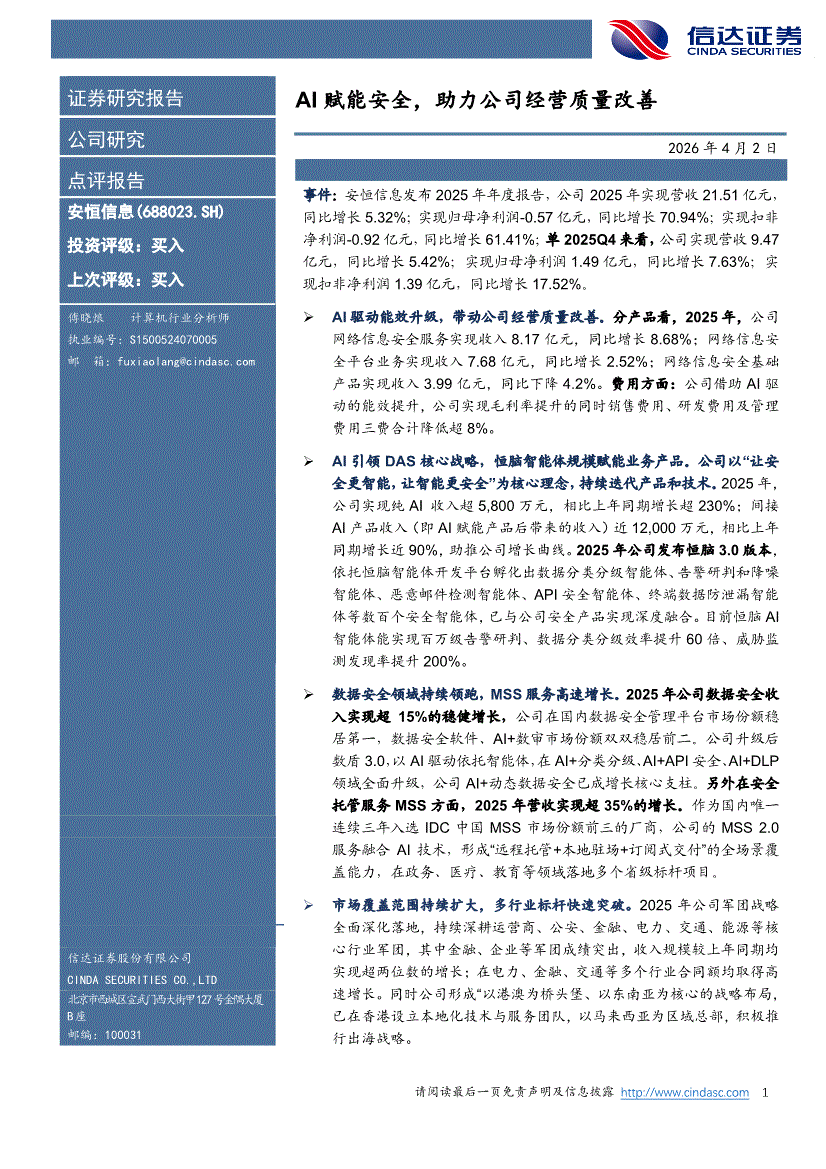 安恒信息:信达证券-安恒信息-688023-AI赋能安全,助力公司经营质量改善-260402