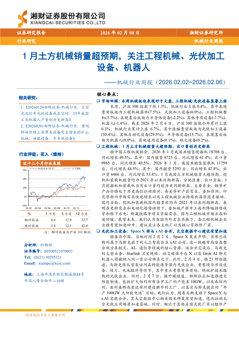机械行业:湘财证券-机械行业周报:1月土方机械销量超预期,关注工程机械、光伏加工设备、机器人-260208