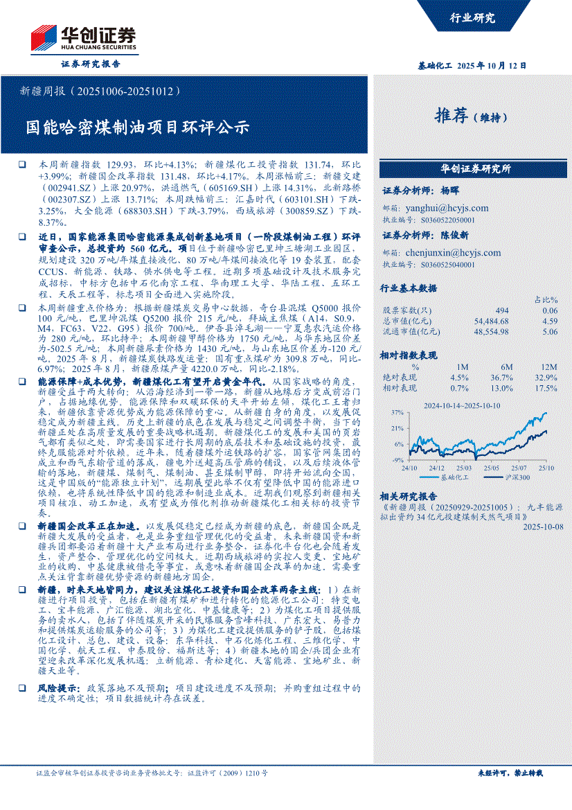 基础化工行业:华创证券-基础化工行业新疆周报:国能哈密煤制油项目环评公示-251012