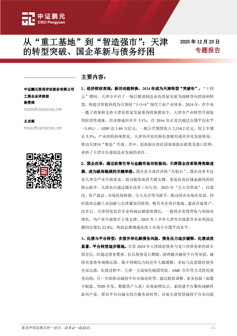 中证鹏元资信评估股份有限公司-从“重工基地”到“智造强市”:天津的转型突破、国企革新与债务纾困-251223