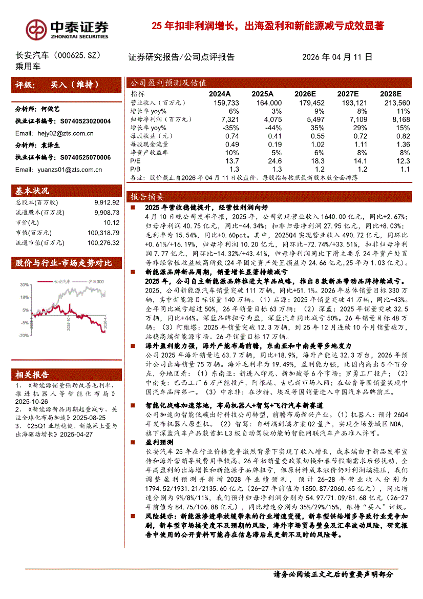 长安汽车:中泰证券-长安汽车-000625-25年扣非利润增长,出海盈利和新能源减亏成效显著-260411