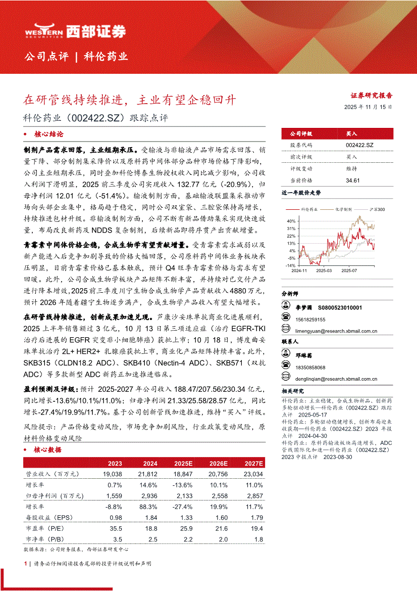 科伦药业:西部证券-科伦药业-002422-跟踪点评:在研管线持续推进,主业有望企稳回升-251115