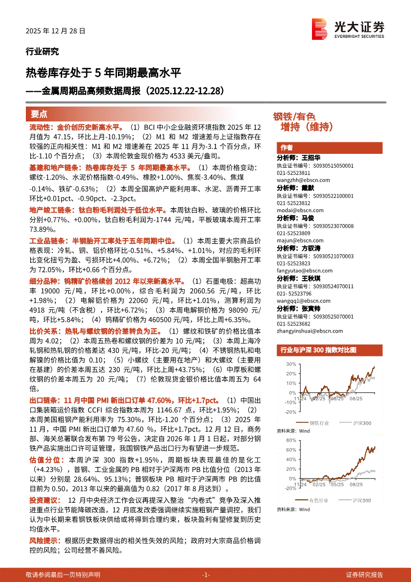 钢铁/有色行业:光大证券-钢铁/有色行业金属周期品高频数据周报:热卷库存处于5年同期最高水平-251228