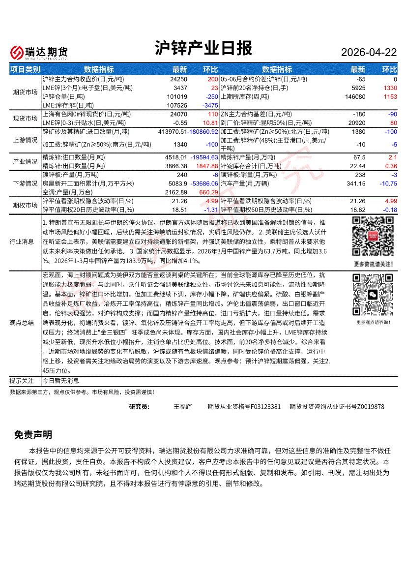 瑞达期货-沪锌产业日报-260422