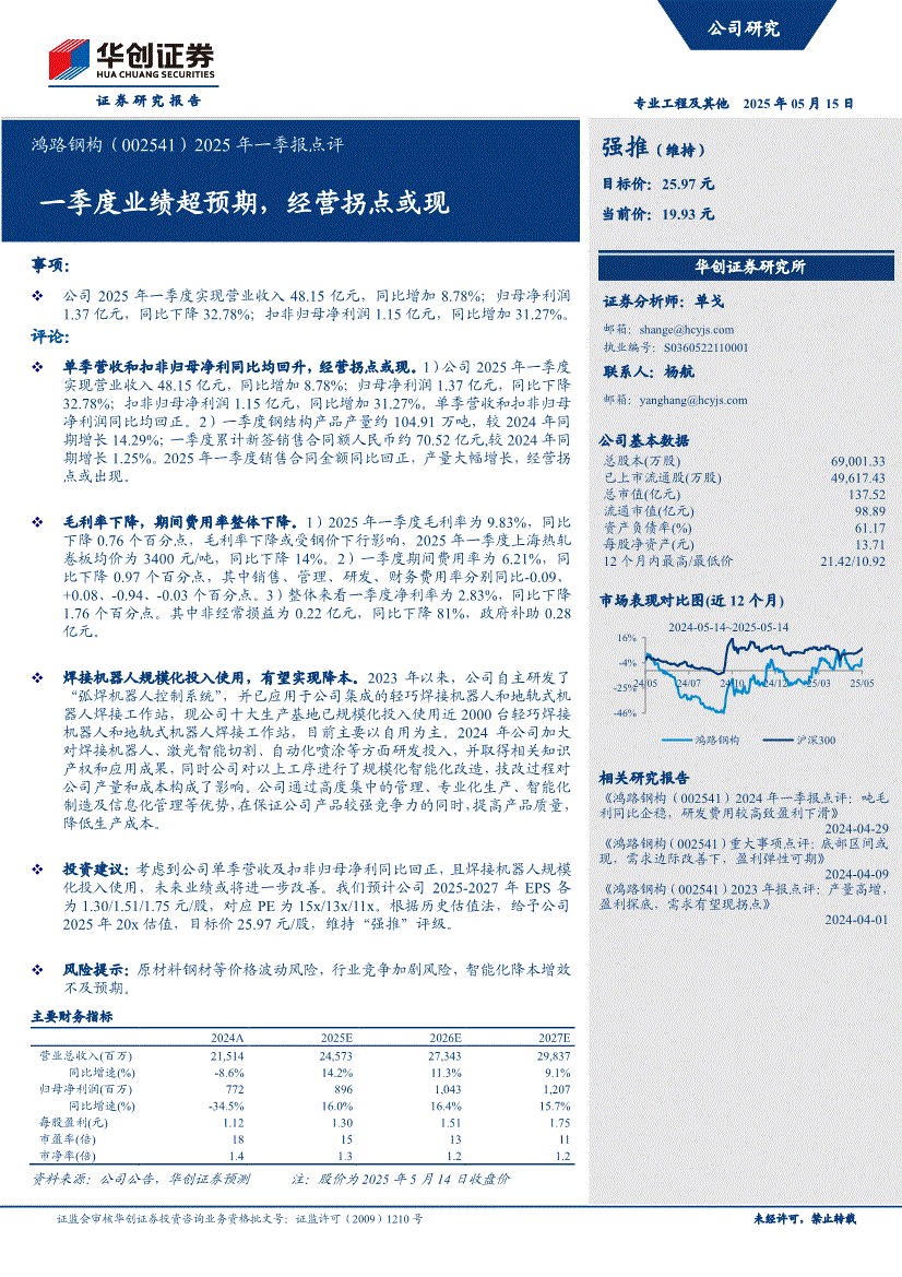 鸿路钢构:华创证券-鸿路钢构-002541-2025年一季报点评:一季度业绩超预期,经营拐点或现-250515