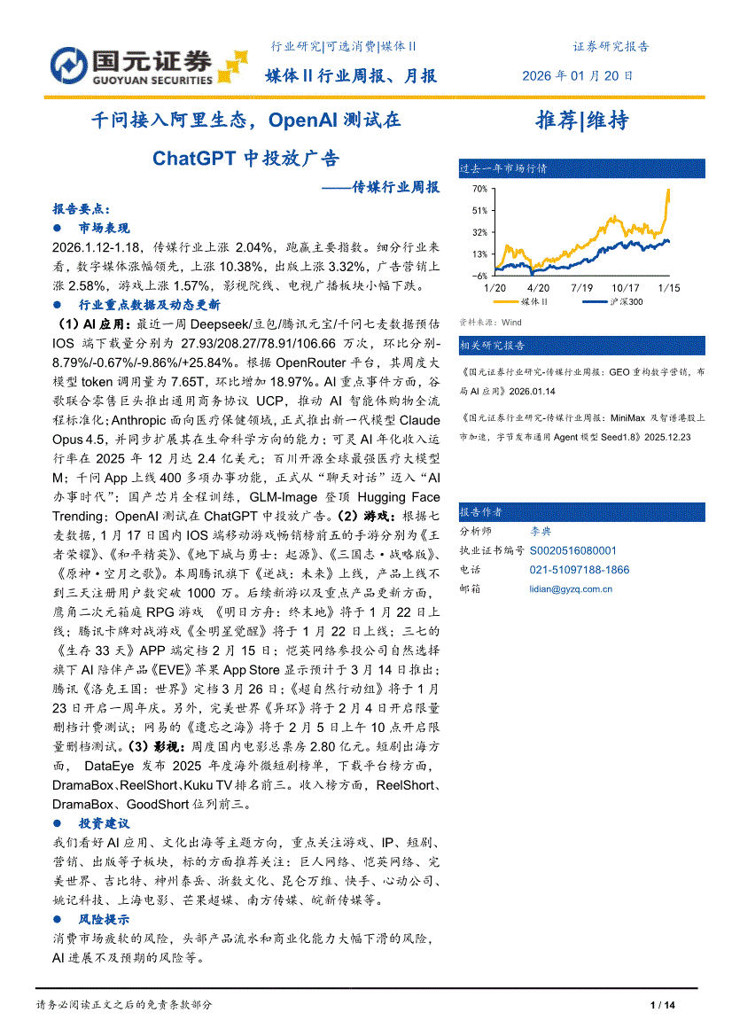 传媒行业:国元证券-传媒行业周报:千问接入阿里生态,OpenAI测试在ChatGPT中投放广告-260120