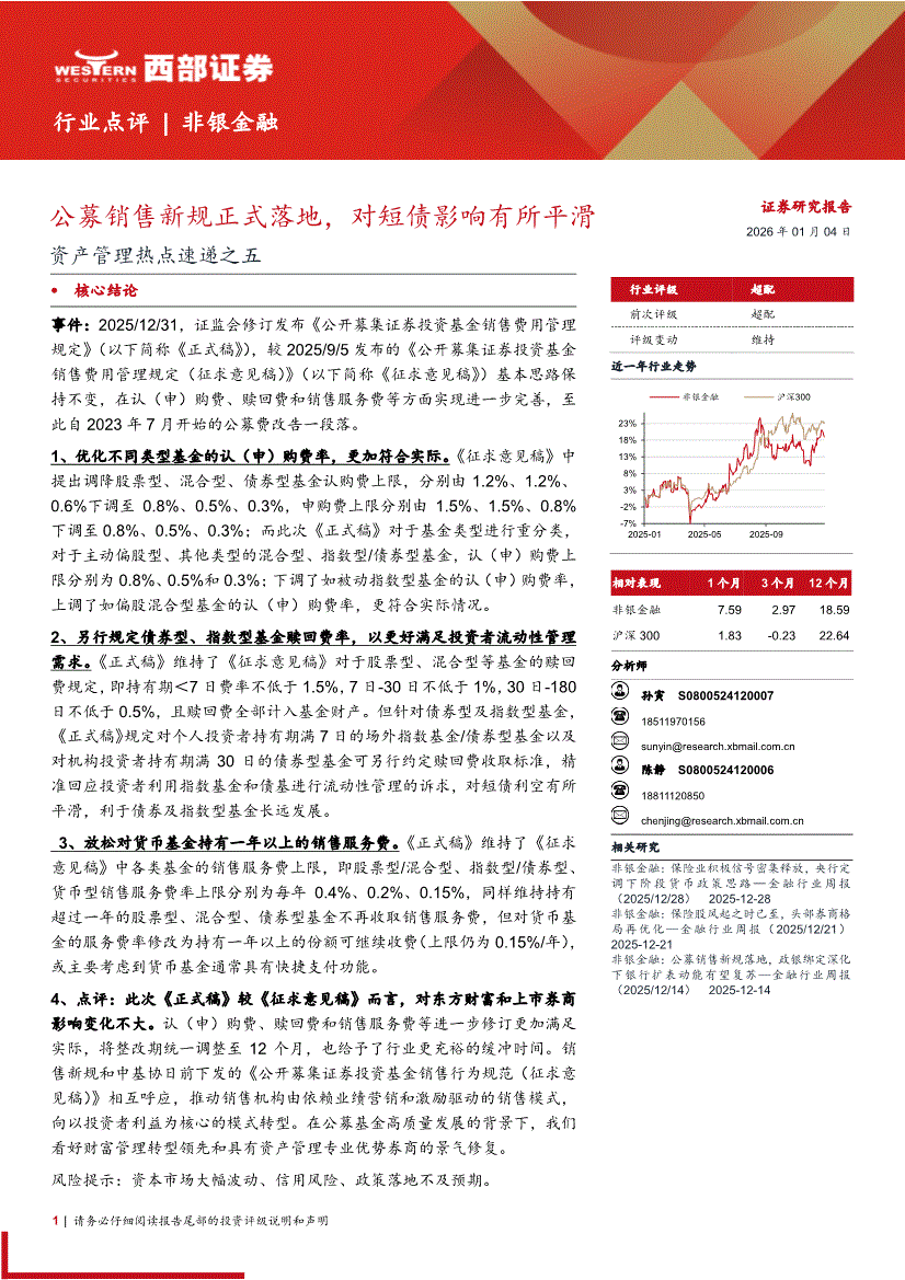 非银金融行业:西部证券-非银金融行业资产管理热点速递之五:公募销售新规正式落地,对短债影响有所平滑-260104
