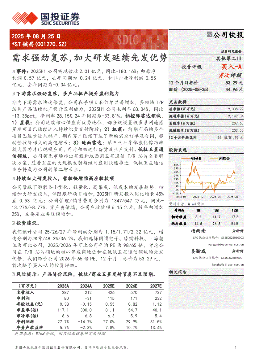 *ST铖昌:国投证券-*ST铖昌-001270-需求强劲复苏,加大研发延续先发优势-250825