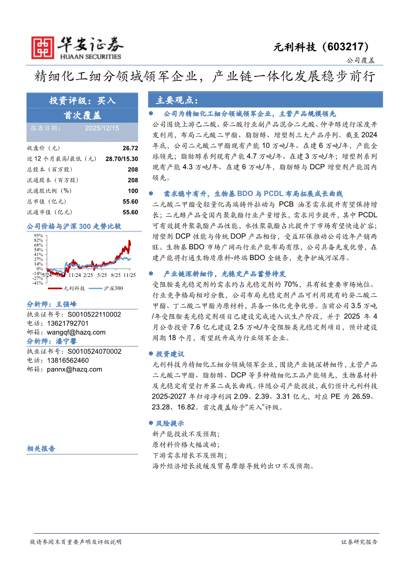 元利科技:华安证券-元利科技-603217-精细化工细分领域领军企业,产业链一体化发展稳步前行-251215