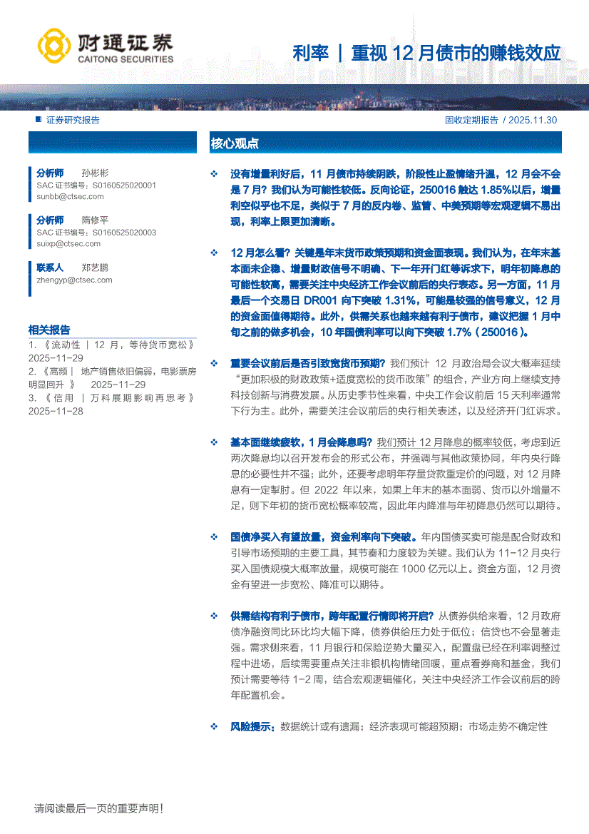 财通证券-利率|重视12月债市的赚钱效应-251130