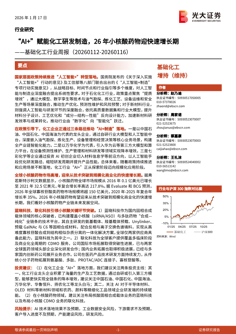 基础化工行业:光大证券-基础化工行业周报:“AI+”赋能化工研发制造,26年小核酸药物迎快速增长期-260117