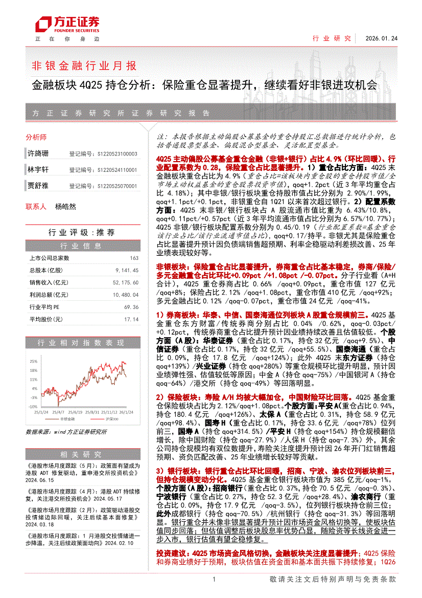 非银金融行业:方正证券-非银金融行业月报:金融板块4Q25持仓分析,保险重仓显著提升,继续看好非银进攻机会-260124