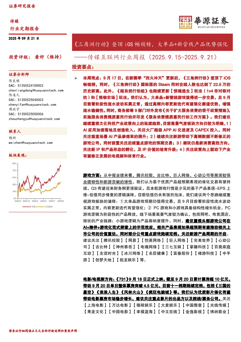 传媒互联网行业:华源证券-传媒互联网行业周报:《三角洲行动》登顶iOS畅销榜,大单品+新管线产品优势强化-250921