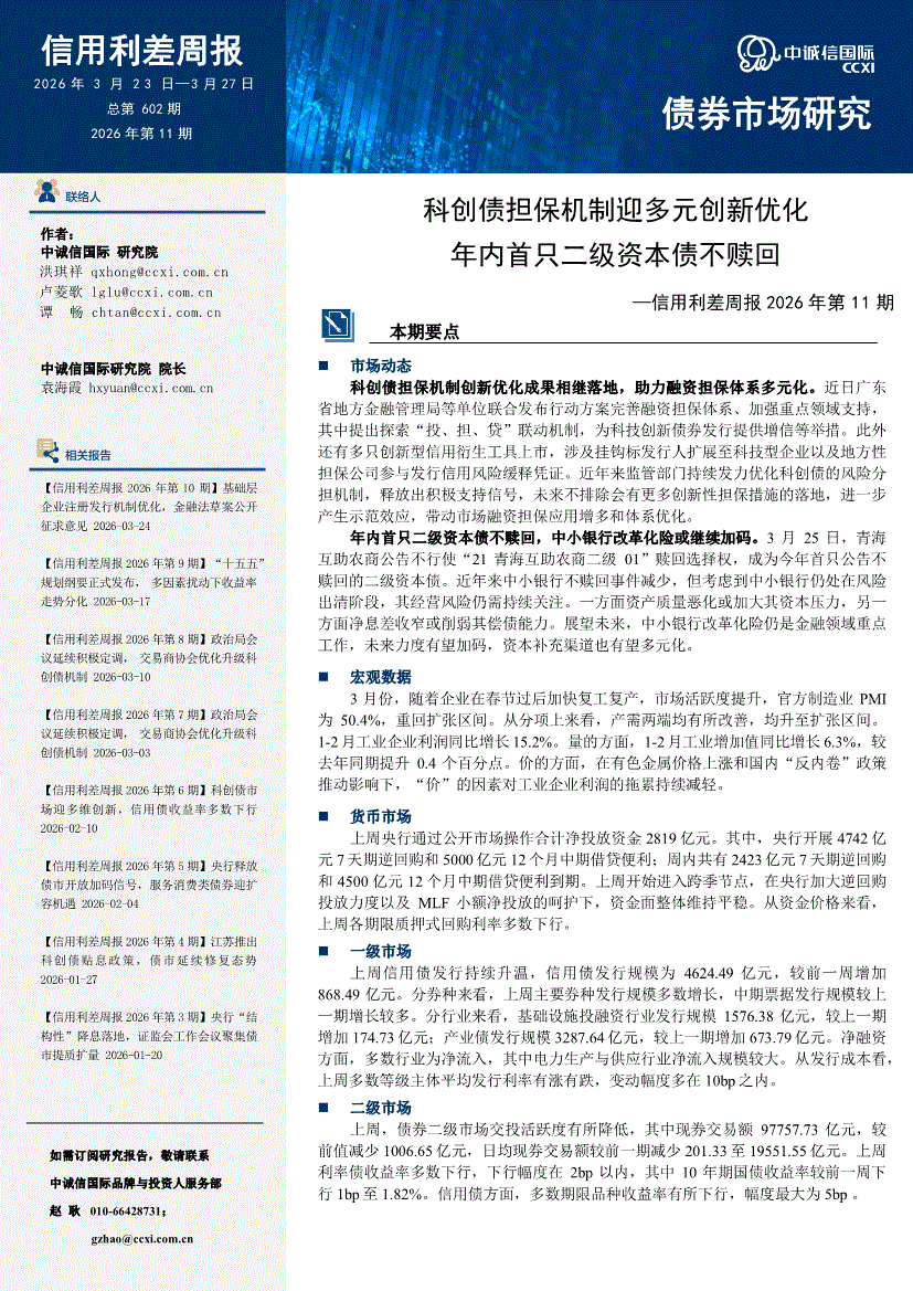 中诚信国际-信用利差周报2026年第11期:科创债担保机制迎多元创新优化,年内首只二级资本债不赎回-260327