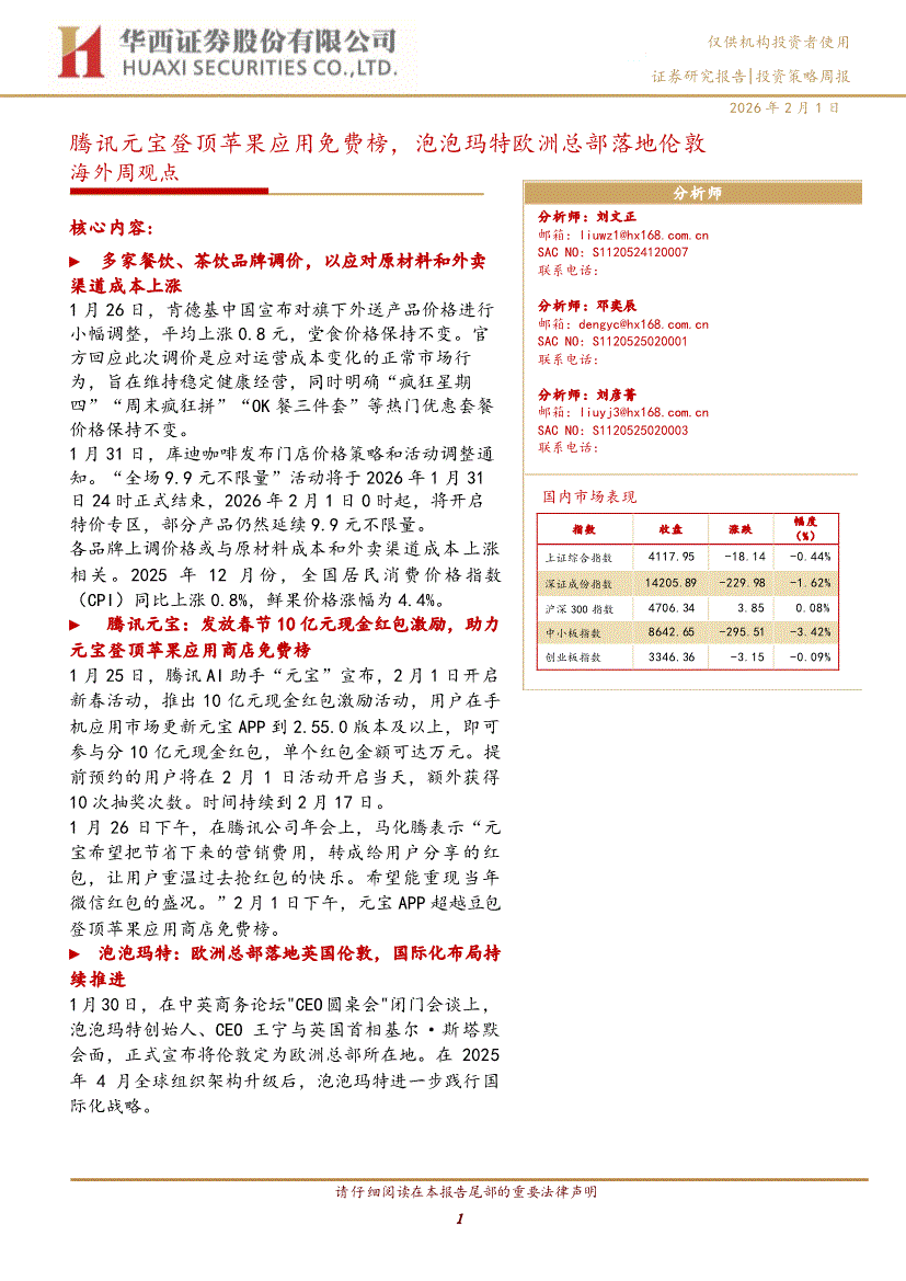 华西证券-海外周观点:腾讯元宝登顶苹果应用免费榜,泡泡玛特欧洲总部落地伦敦-260201