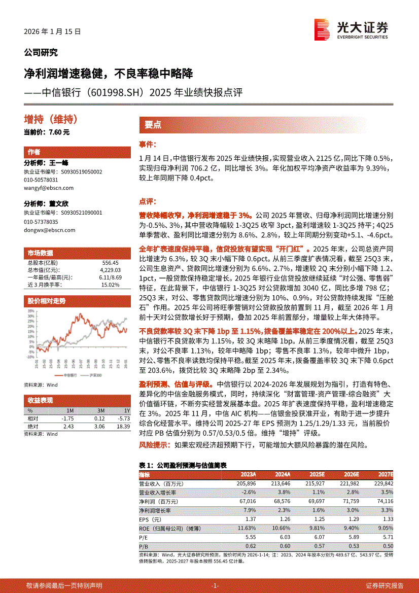 中信银行:光大证券-中信银行-601998-2025年业绩快报点评:净利润增速稳健,不良率稳中略降-260115