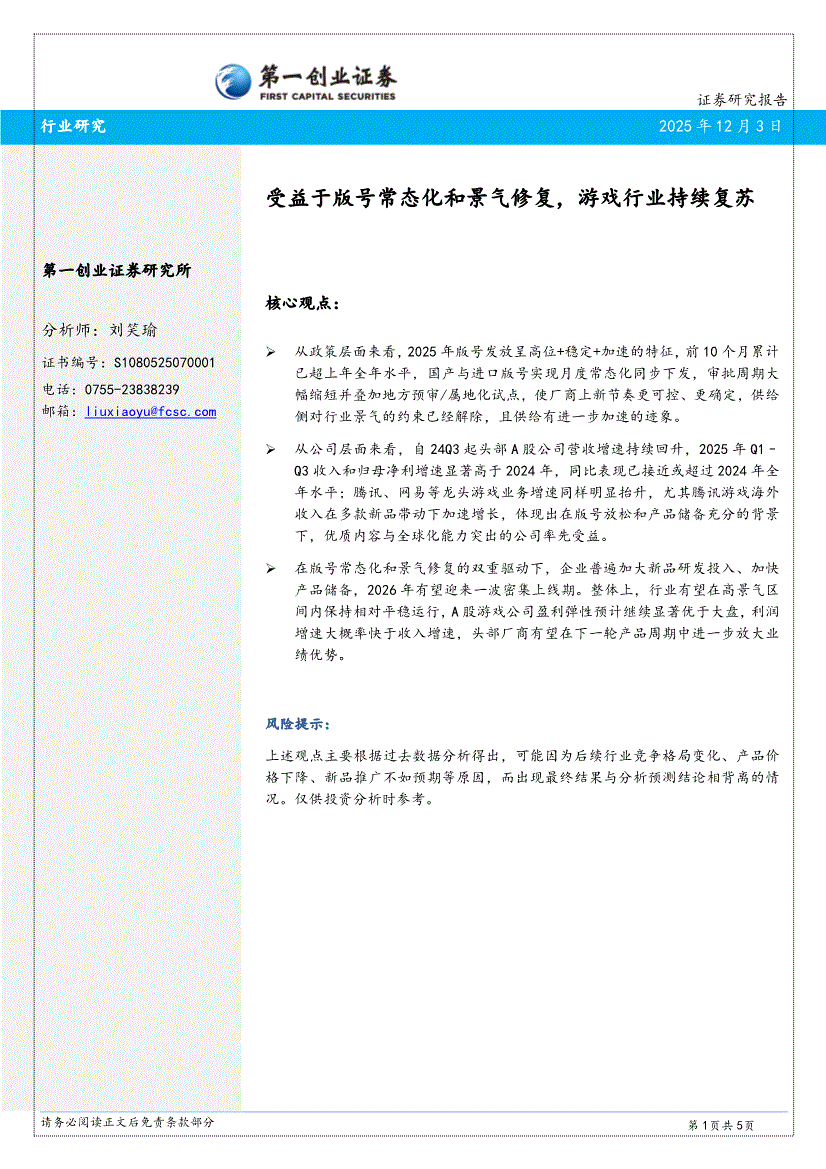 游戏行业:第一创业-游戏行业:受益于版号常态化和景气修复,游戏行业持续复苏-251203