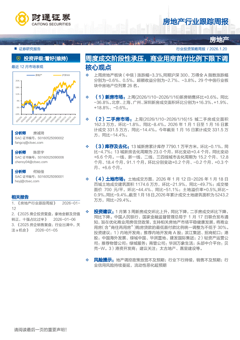 房地产行业:财通证券-房地产行业跟踪周报:周度成交阶段性承压,商业用房首付比例下限下调-260120