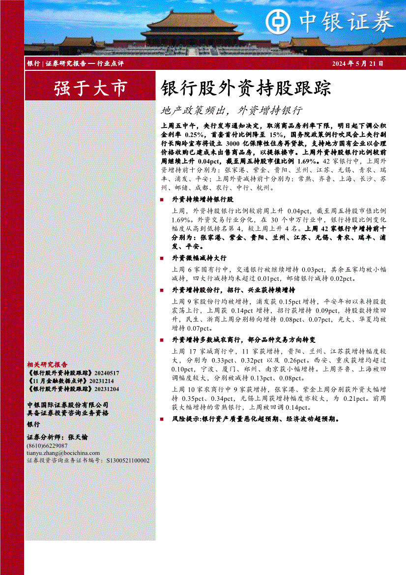 银行业:中银国际-银行业股外资持股跟踪:地产政策频出,外资增持银行-240521