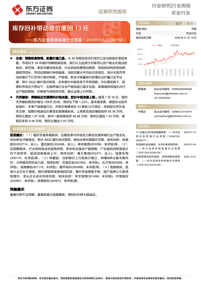 农林牧渔行业:东方证券-农林牧渔行业周报:库存回补带动猪价重回13元-260118