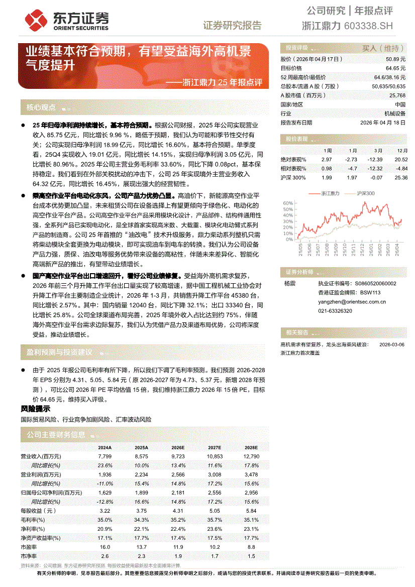 浙江鼎力:东方证券-浙江鼎力-603338-25年报点评:业绩基本符合预期,有望受益海外高机景气度提升-260418