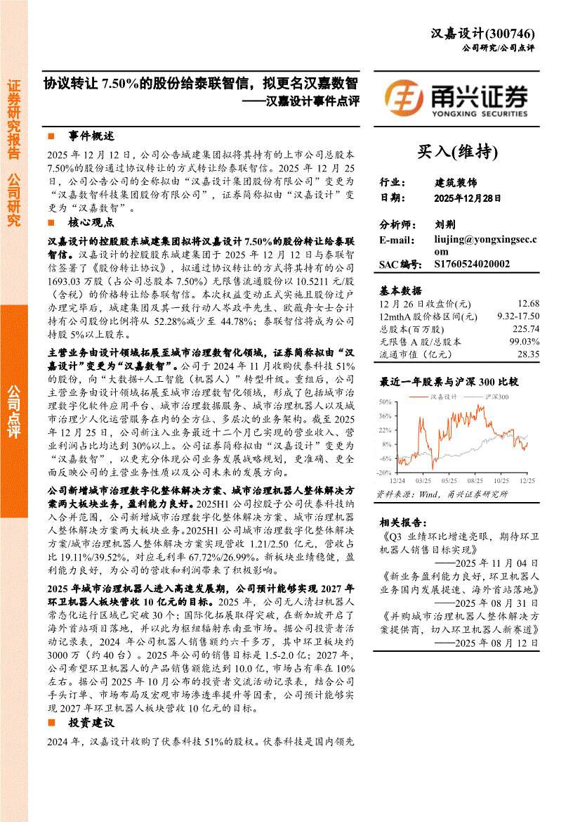 汉嘉设计:甬兴证券-汉嘉设计-300746-事件点评:协议转让7.50%的股份给泰联智信,拟更名汉嘉数智-251228