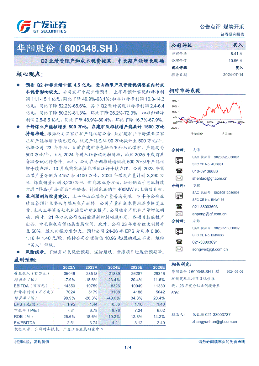 华阳股份:广发证券-华阳股份-600348-Q2业绩受限产和成本税费拖累,中长期产能增长明确-240714