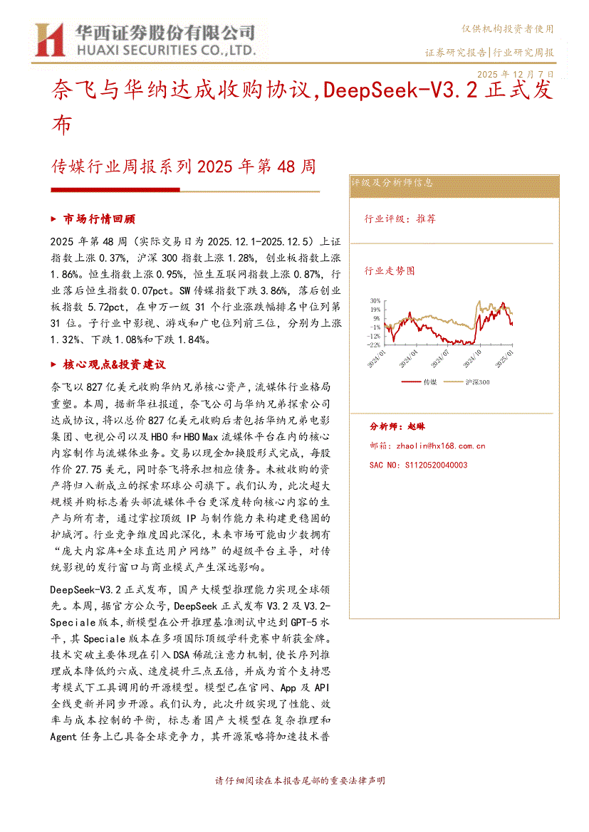传媒行业:华西证券-传媒行业周报系列2025年第48周:奈飞与华纳达成收购协议,DeepSeek~V3.2正式发布-251207
